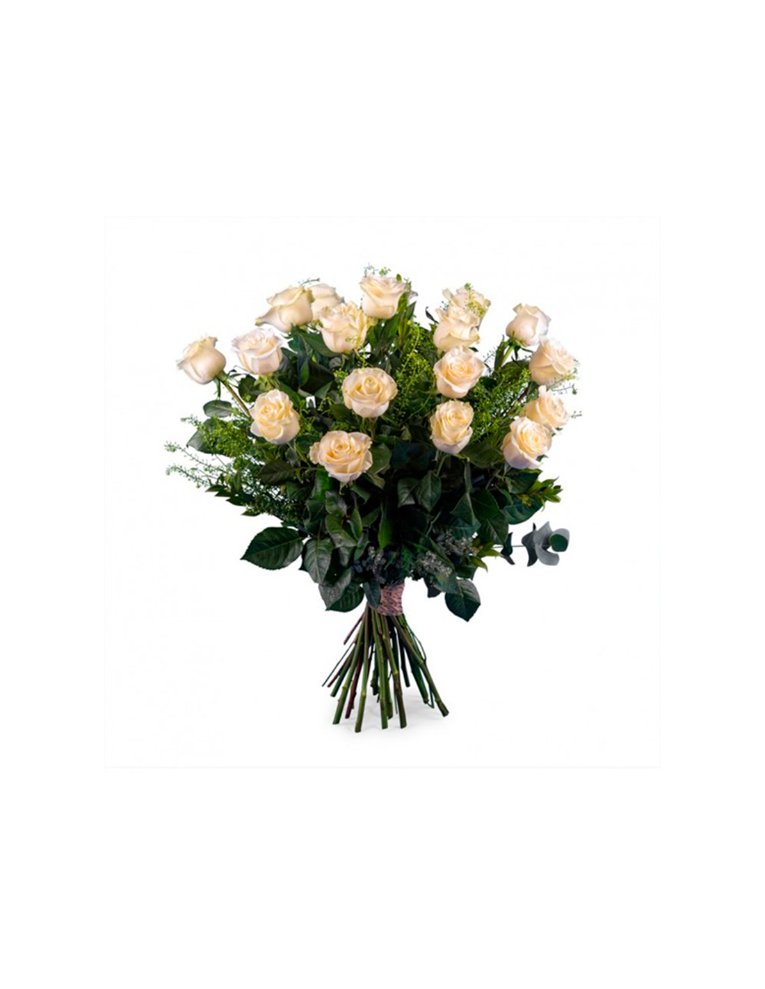 12 Rosas blancas de tallo largo acompañadas de verdes.